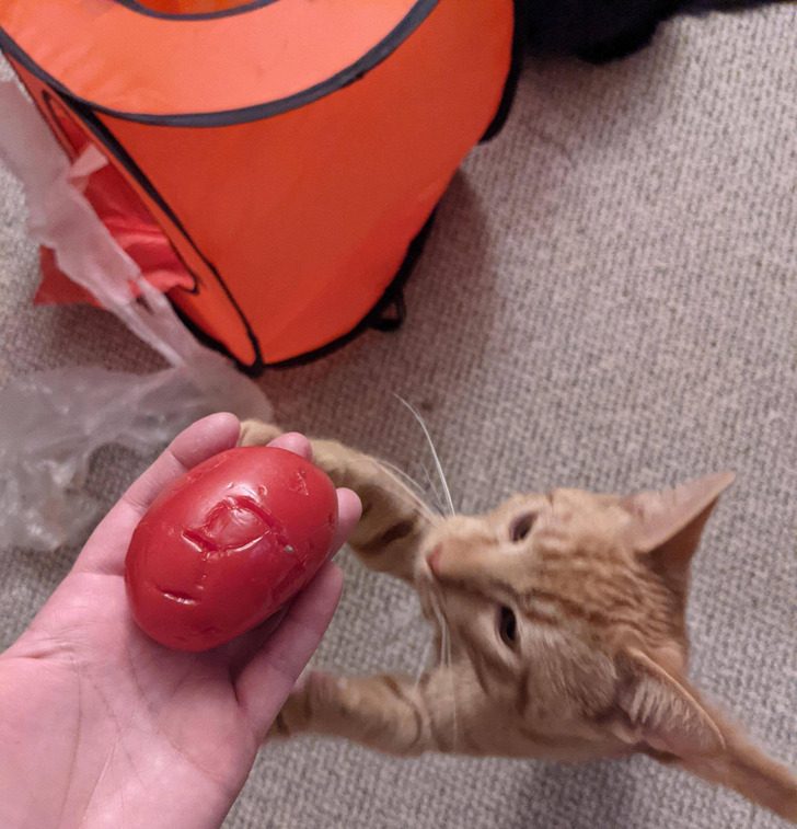«Купила 6 помидоров, прихожу домой, а 5 из них разбросаны по кухне. Стало интересно, куда подевался 6-й и сам пакет. Выяснилось, что наш котенок спрятал их в своем логове»