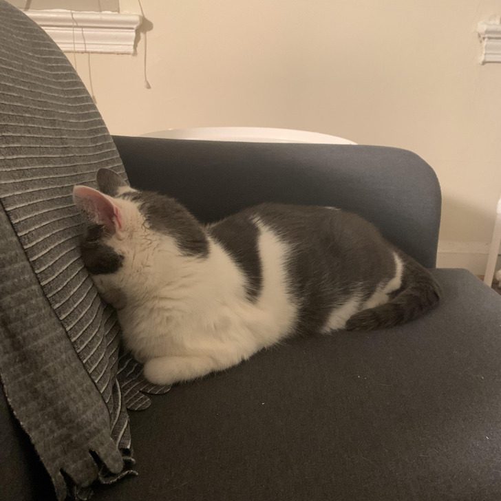«Это Моцарелла, и она любит спать, уткнувшись мордочкой в твердую поверхность. Никто не знает, почему она так делает»