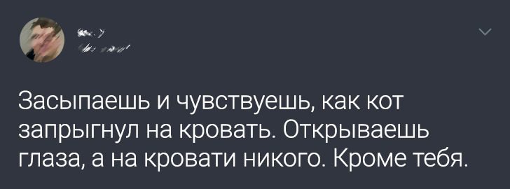 «Кота моего недавно не стало. Но утром я вдруг чувствую, как он будит меня, покусывая пальцы. Резко поднимаюсь. Нет никакого кота. Думаю, он так попрощаться приходил»