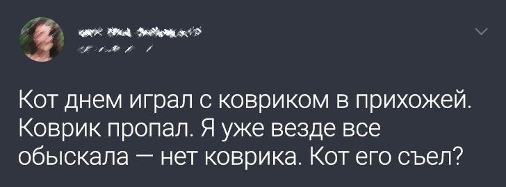 «Кошка оторвала кусок обоев и больше их не дерет. Я тут присмотрелся и понял, что это напоминает ее „автопортрет“. Мать говорит, что я демона дома приютил»