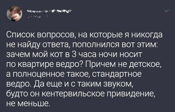 «Кот забирался на меня по левой ноге, потом шел по животу, груди, плечу и голове. Спускался с правой стороны, бормоча: „Нгау, мру, ур, мф“. Ритуал, что ли, проводил?»
