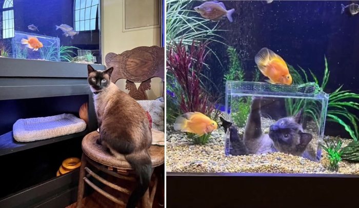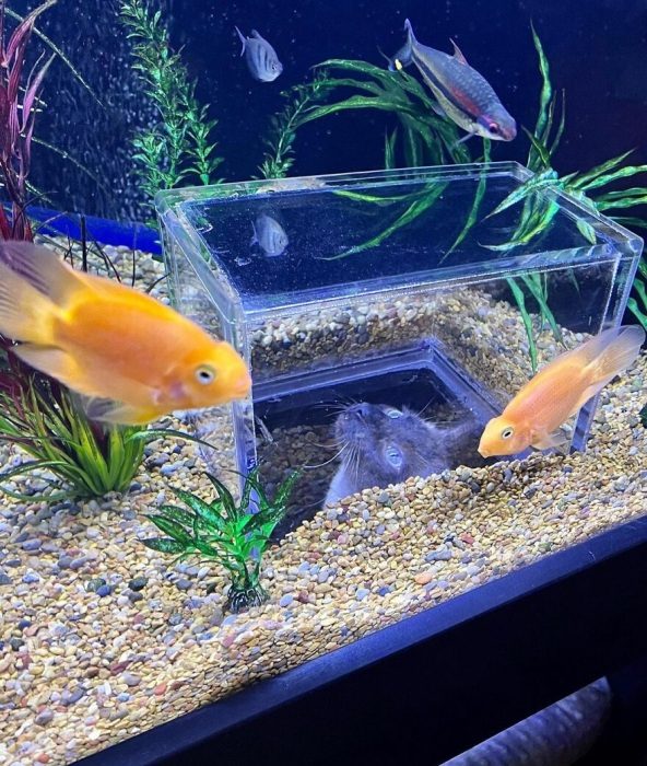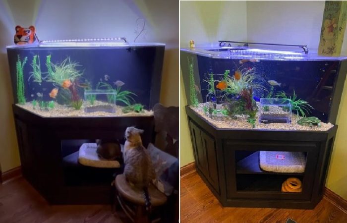Хозяева заказали мастеру по аквариумам вставить в емкость с рыбами прозрачный куб без дна так, чтобы кошки могли наполовину влезть туда. Так и появился этот необычный аквариум.