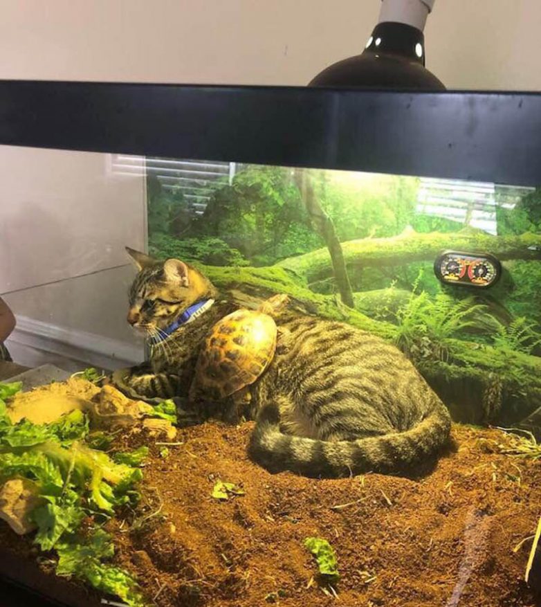 Коту нравится проводить время в террариуме вместе с черепахой. Да и она не против такой компании.