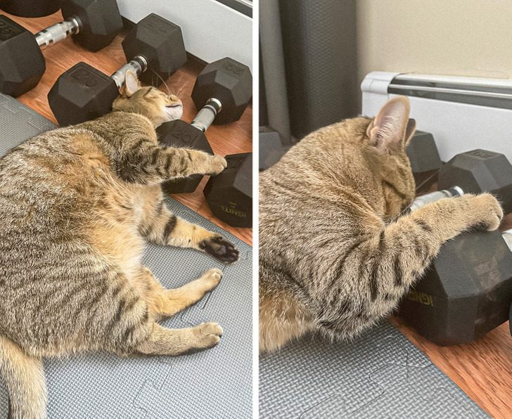 Почему моя кошка их так любит? У нее целый дом игрушек, но она предпочитает обниматься с 9-килограммовыми гантелями»