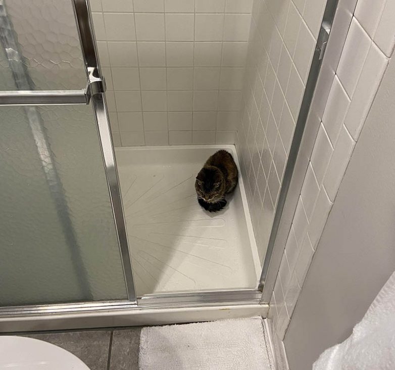 16. “Когда я выхожу из душа, моя кошка непременно занимает мое место и сидит в мокром поддоне”