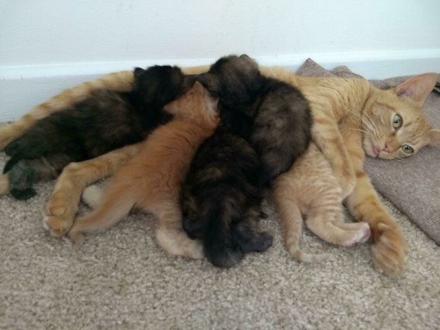 Кошка с котятами — это всегда как символ материнского счастья. Конечно если это кошка домашняя и у неё хорошие хозяева. Её мордочка излучает удовольствие, она мурлыкает над своими малышами.