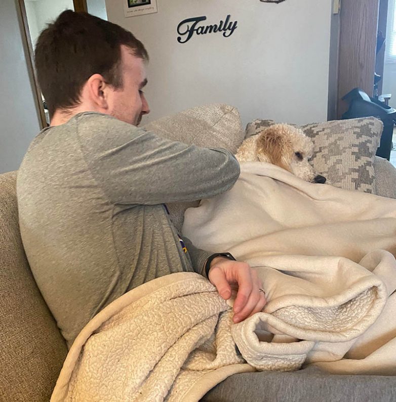 “Мой отец всегда хотел большую собаку и не признавал маленьких пород. Он был не очень доволен когда мы взяли болонку. Но теперь специально ставит её лежак рядом со своим рабочим местом, чтобы её не было одиноко.”
