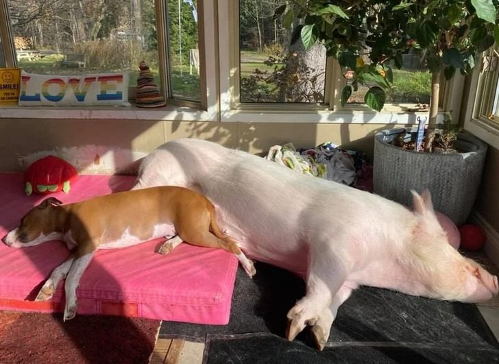 Свинка дремлет на солнышке рядом со своим лучшим другом