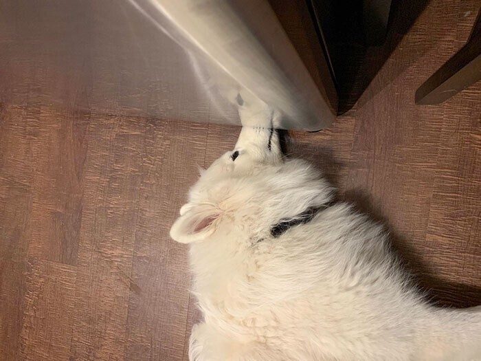 «Он громко лаял и знал, что его будут ругать, — поэтому спрятался под холодильник. Ну, он так считает»