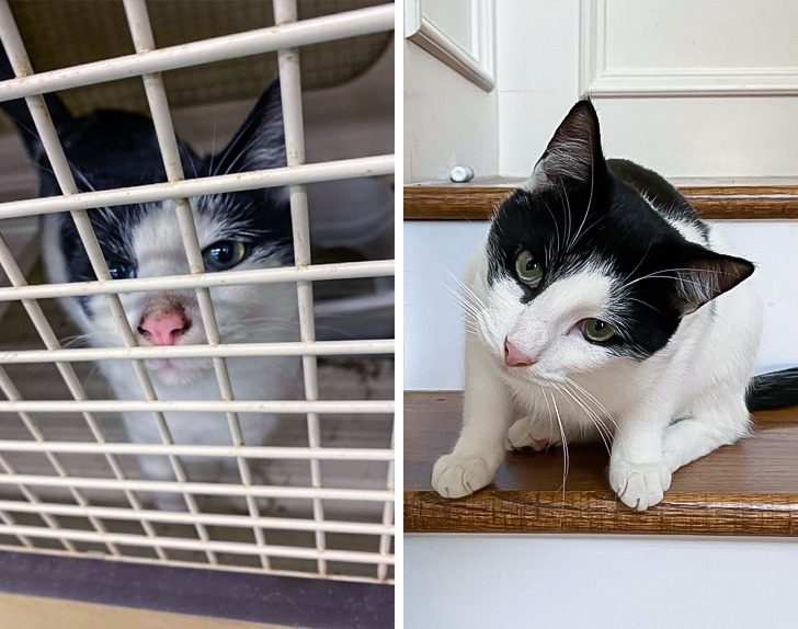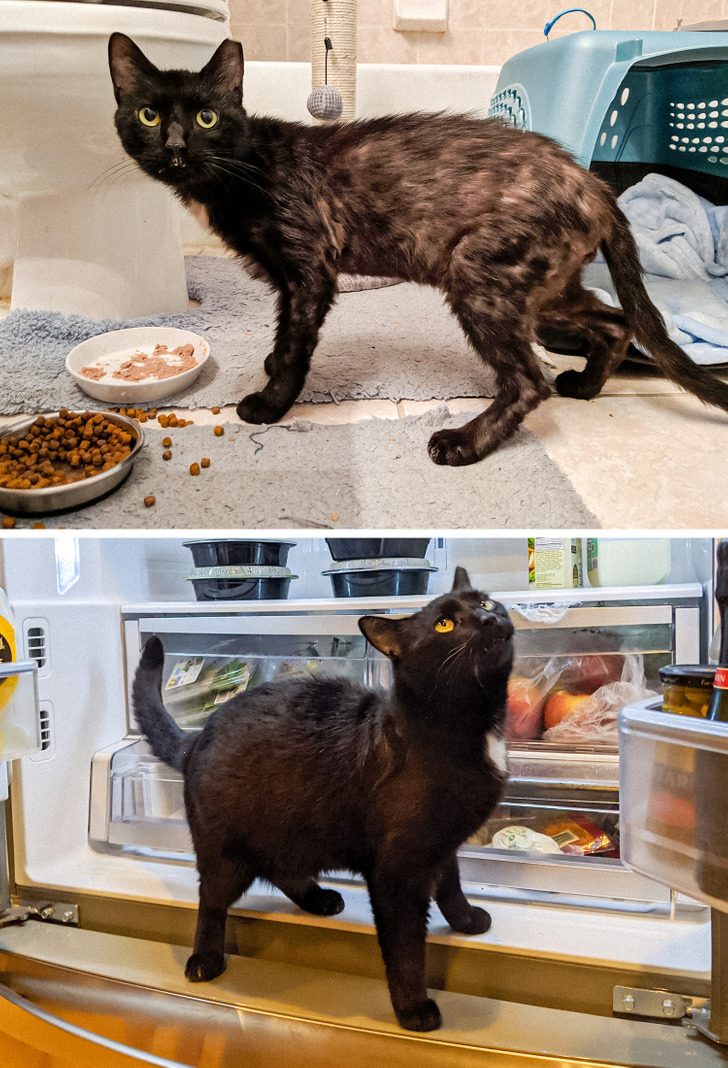 «Наш кот в день, когда мы его только приютили, и спустя 11 месяцев жизни с нами»