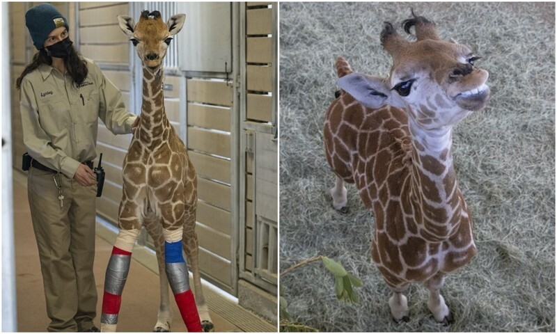 Самка жирафа по кличке Мситуни (Msituni) родилась в зоопарке Сан-Диего с особенностью — гиперэкстензией суставов. Из-за этого у нее были проблемы с суставами на ногах и сильное искривление, и она не могла нормально ходить. Такое заболевание представляет опасность для дальнейшей жизни и роста детеныша, поэтому помочь малышке вызвалась целая команда специалистов.