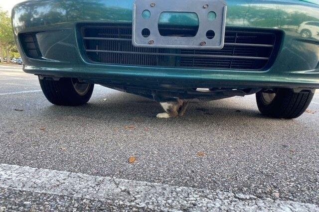 В машину в отсутствие хозяина попыталась влезть кошка, но она застряла под днищем, являя на всеобщее обозрение лишь половину своего тела.