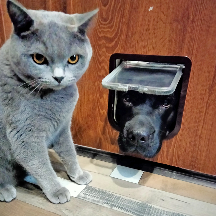 «Вставил в дверь лаз для кота, чтобы он мог ходить есть на кухню, а песель не съедал его корм. Теперь только сядешь поесть — сразу вот это перед глазами»