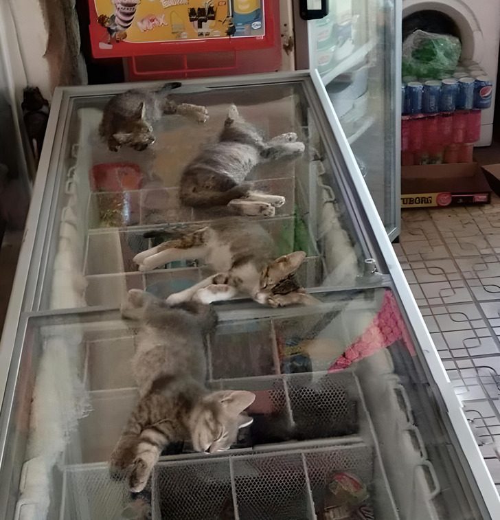 На улице было очень жарко, поэтому продавщица разрешила котятам спать на холодильнике