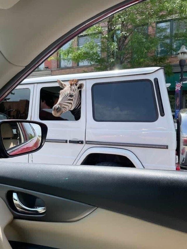 Раз зебра разъезжает по городу на машине, разумеется, она не такая уж дикая. Но, согласитесь, встреча всё равно внезапная и эффектная.