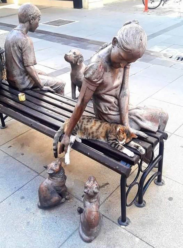 14. Настоящий котик решил разнообразить компанию своих собратьев, сделанных из бронзы