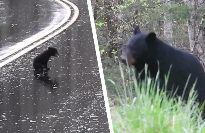 Медведица следит из леса, что малыши творят на дороге