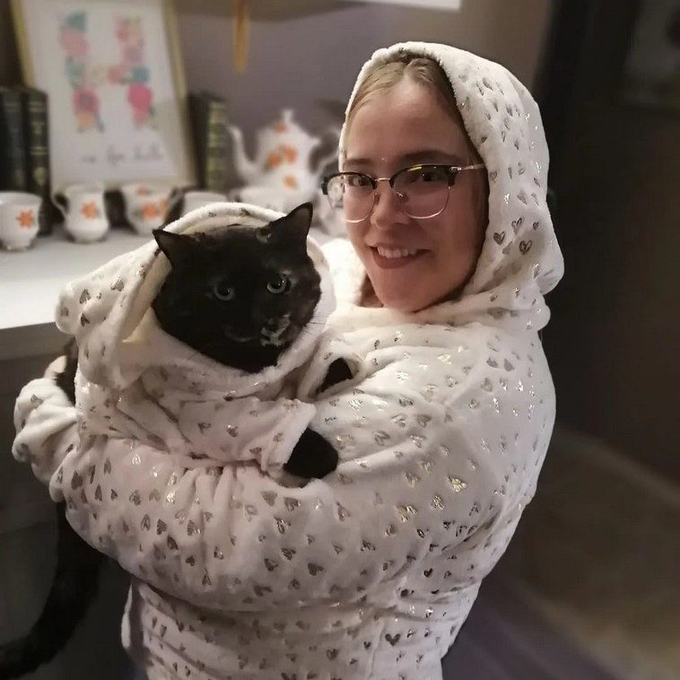 10. Хозяйка и её кот в одинаковых худи ручной работы