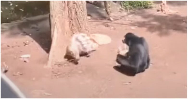 Туристы стали свидетелями забавного эпизода из жизни животных. Гиббон подошёл к мирно дремавшему на солнышке дикобразу и из любопытства ткнул ему пальцем в морду. Колючему грызуну это не понравилось и он решил догнать своего обидчика.
