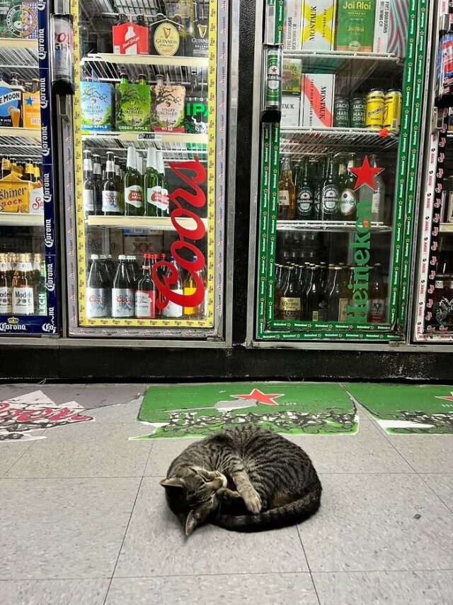 Этой причиной являются кошки, которые зачастую встречают и приветствуют ничего не подозревающих покупателей прямо на полках с чипсами или из полупустой коробки в углу. Иногда они сидят или лежат прямо возле дверей, становясь пушистыми магазинными швейцарами. (Ленивыми.)