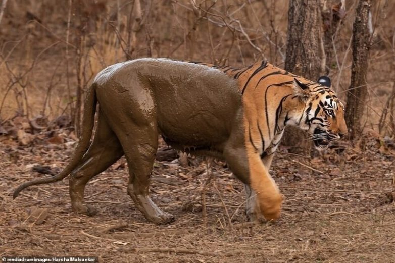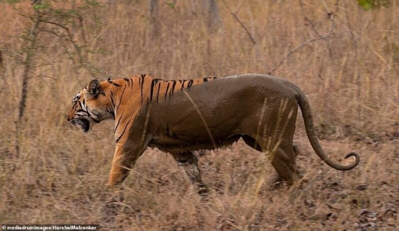 Во время поездки по национальному парку Тадоба-Эндхари в Индии, фотограф по имени Харшал Малванкар (Harshal Malvankar) заметил этого необычного тигра. Он сразу обратил на него внимание, и издалека не мог понять, почему половина хищника «сливается» с округой. Подъехав поближе, он увидел, что тигр только что принял грязевую ванну.