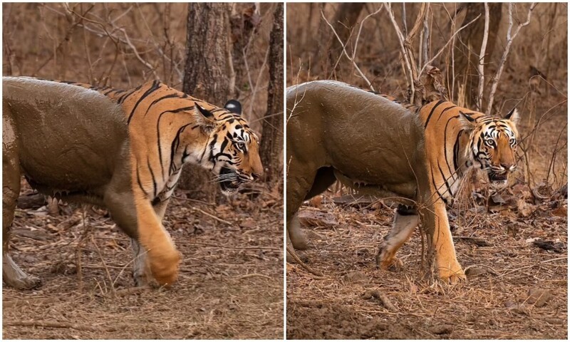 В индийском национальном парке Тадоба-Эндхари фотограф сделал интересные кадры с тигром. Сначала он не понял, почему тигр наполовину другого цвета и сливается с округой — но потом подъехал поближе.