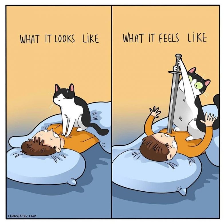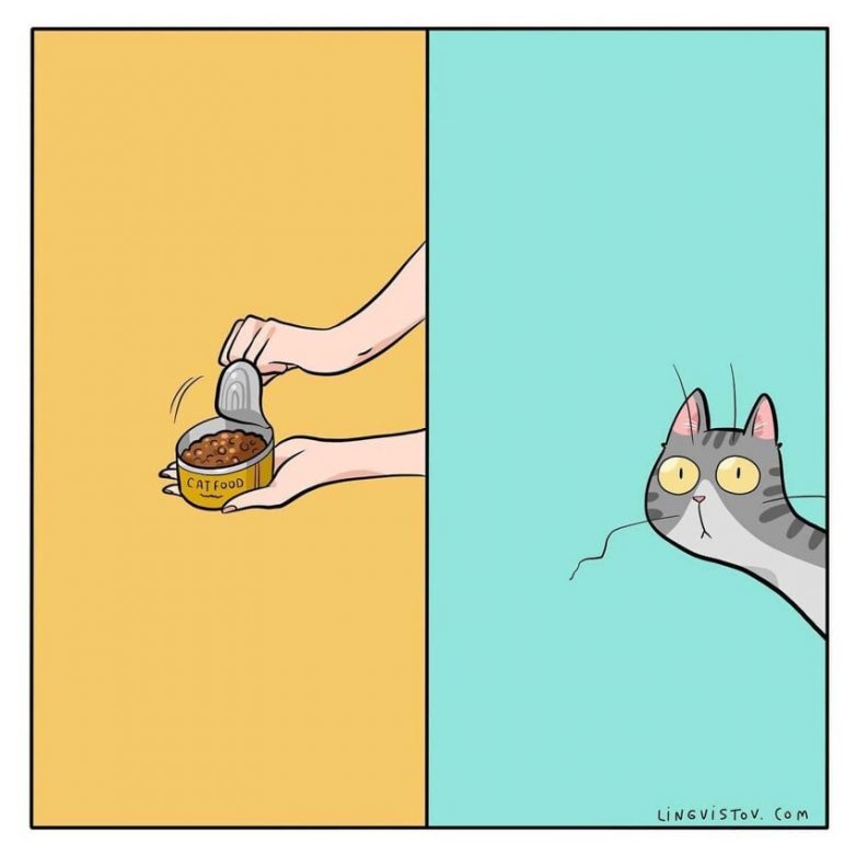Художница-которисовательница под псевдонимом Lingvistov не просто является владелицей четвероногого друга, но и много общается с другими любителями котов через социальные сети. В своих комиксах она отображает самые яркие особенности этих животных, подмечая их забавные черты характера. Возможно, в этих зарисовках вы узнаете себя и своего кота.
