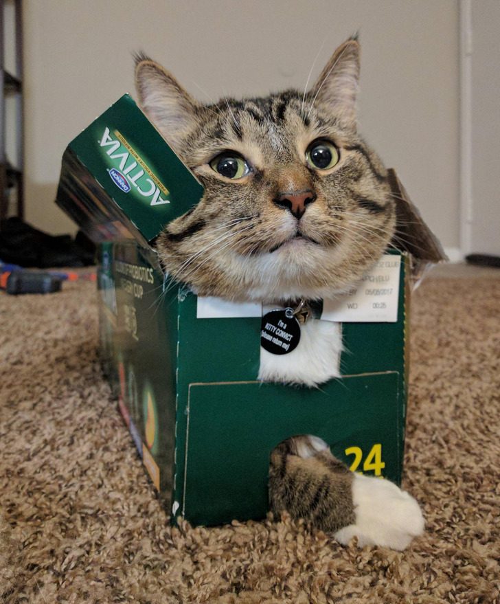 Многие питомцы предпочитают удобным лежанкам тесные ведра, коробки, головные уборы, пакеты и даже стаканы.