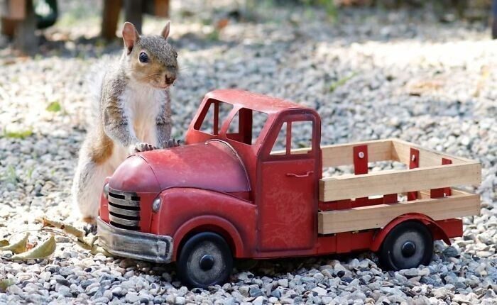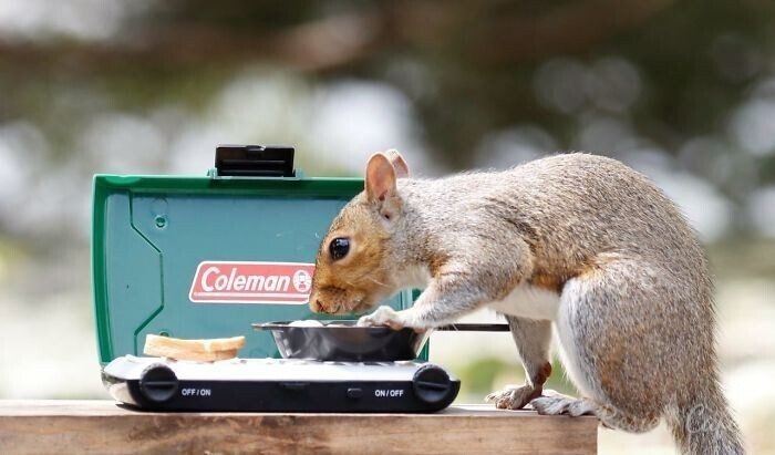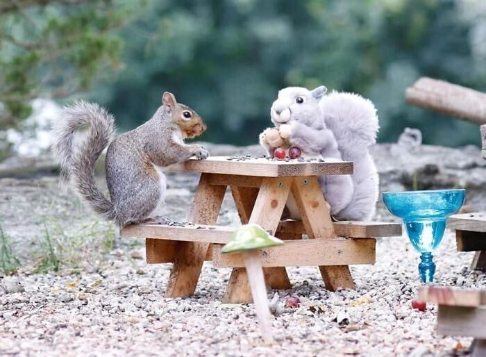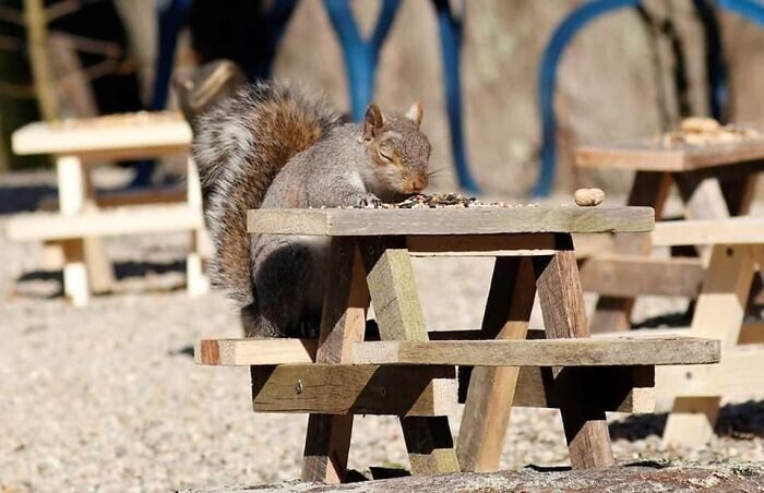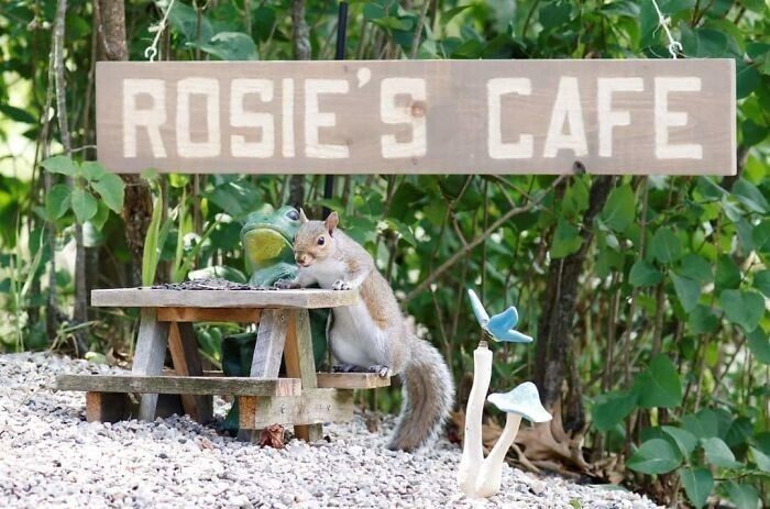 «Из-за карантина мне было одиноко, и я искала источники радости. К сожалению, пойти было особо некуда, и я решила организовать небольшой уютный уголок прямо в своем дворе. Мой муж смастерил шесть маленьких столиков для кормления белок, и я начала фотографировать посетителей. Теперь я каждый день добавляю в этот уголок что-то новое, чтобы развлечь пушистиков. У нашего кафе даже появилось название — Rosie’s,» — рассказала фотограф.
