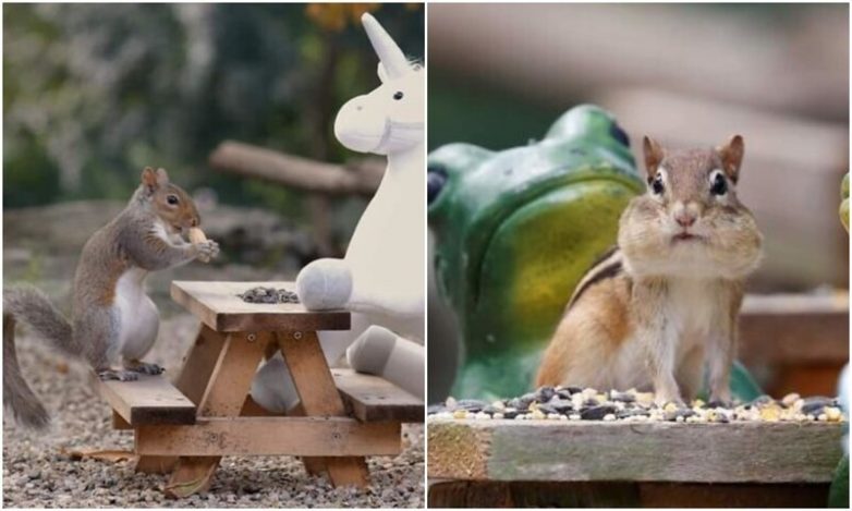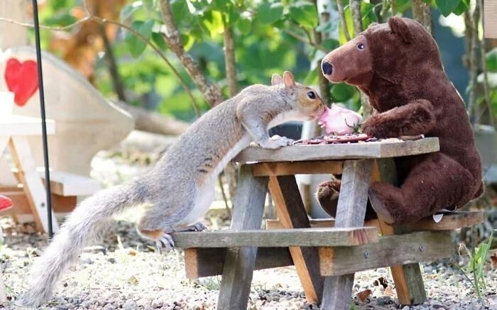 В мини-кафе — деревянные столики, игрушечные посетители, симпатичные декорации, посуда, и конечно же, много угощений на любой вкус. В основном полакомиться приходят белки и бурундуки. Получаются чудесные снимки — как будто из сказки о миниатюрном городе, где обитают очаровашки-грызуны.