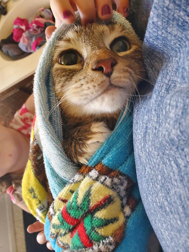 16. “Кошка не слишком любит водные процедуры, но ей точно нравится то, что после купания она сидит у меня на руках, завернутая в теплое полотенце”