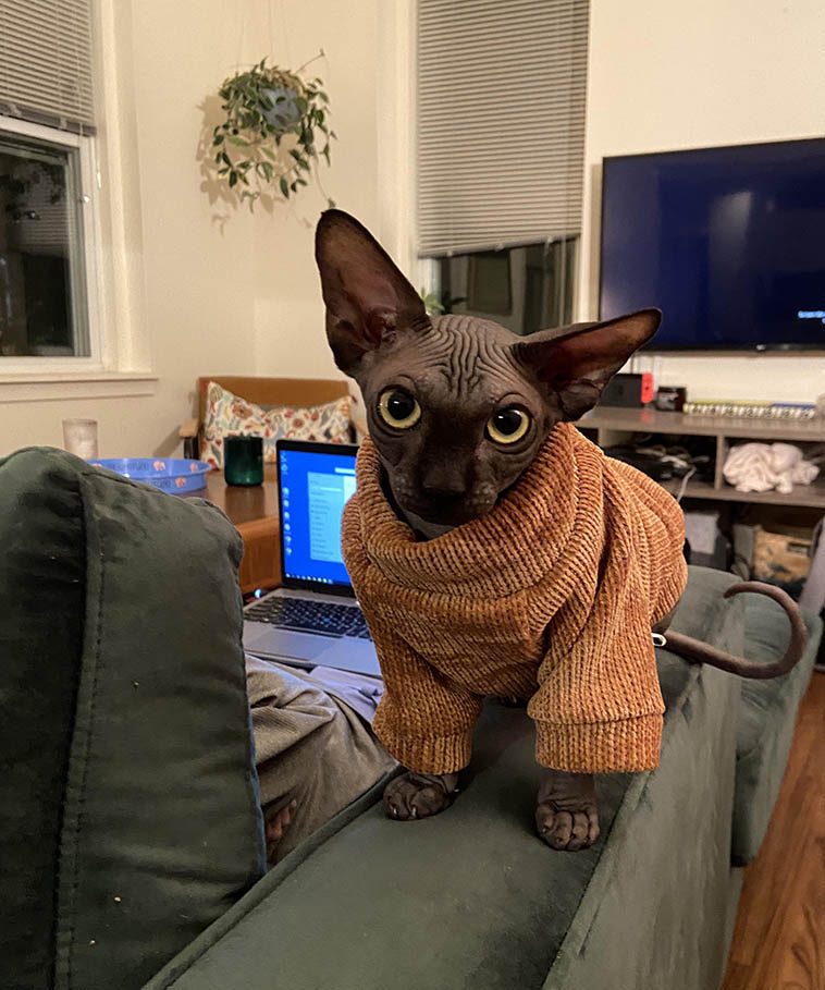 1. Сфинксы часто мерзнут, поэтому теплый свитер для них — это не роскошь, а необходимость