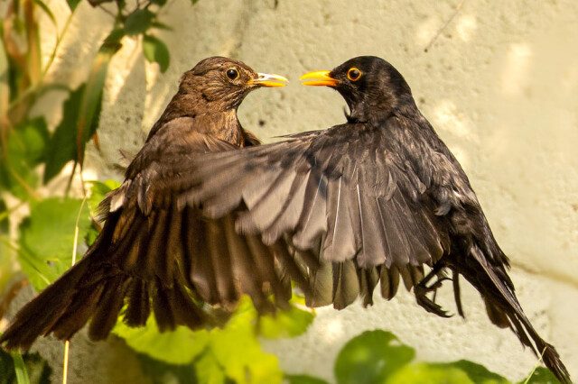 14. Похоже на поцелуй, но на самом деле самец и самка дрозда дерутся в полёте в Чарлтон Адаме, Сомерсет, июль 2022 г. (фото: Ben Pulletz/Solent News)