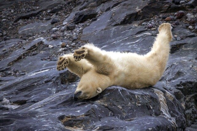 7. Белого медведя запечатлели у острова Шпицберген в Северном Ледовитом океане во время экспедиции турецкой научно-исследовательской группы, 23 июля 2022 г. Учёные вернулись в Стамбул после 22-дневной экспедиции, во время которой, были собраны данные о численности морских зайцев, кольчатых нерп, гренландских тюленей, финвалов, малых полосатиков, горбатых китов, белух, косаток, таких видов птиц, как гагарка, полярная чайка, вилохвостая чайка и белых медведей в Северном Ледовитом океане. (фото: Ozge Elif Kizil/Anadolu Agency via Getty Images)