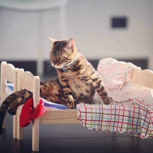 Домашние животные, как известно, многое любят повторять за своими владельцами. Некоторые кошки, например, предпочитают ложиться спать вместе со своими хозяевами. В кровать. Поэтому некоторые хозяева покупают им отдельные кровати, что комфортно спать было всем в доме.