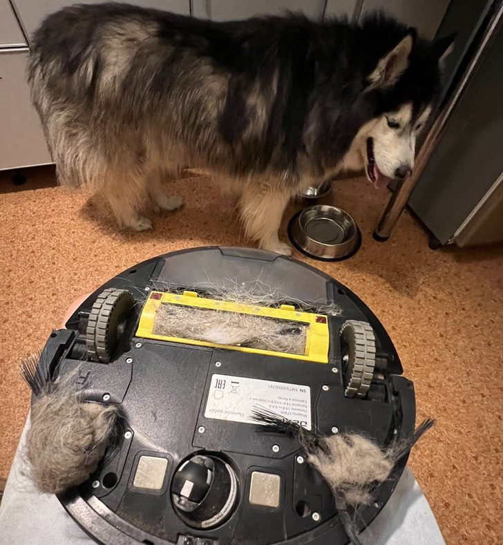 «Робот-пылесос против хаски. Этот бой пылесосик проиграл, а пес только рад»