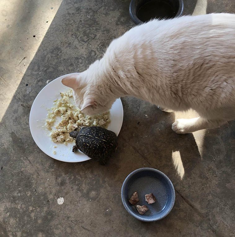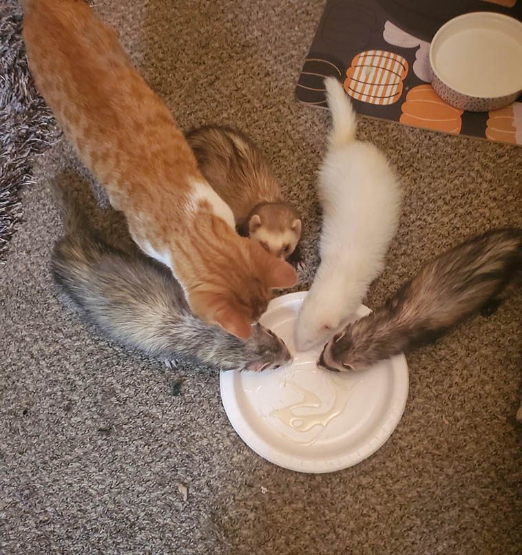 3. Хорьки приняли кошку в свою компанию и даже делятся с ней вкусным лососевым жиром