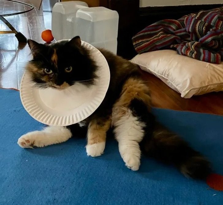 «Мы попробовали несколько конусов, рекомендованных ветеринаром, и они довольно дорого обошлись нам. Однако моя милая кошечка, кажется, предпочитает простую бумажную тарелку».