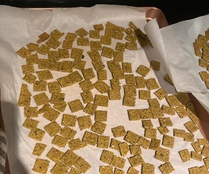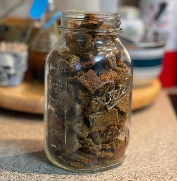 «Я держу все безопасные для собак пищевые отходы в морозильной камере до тех пор, пока их не наберется достаточно для того, чтобы испечь новую партию. Смешиваю их с молотым овсом, небольшим количеством воды и арахисовым маслом, пока консистенция не станет густой. Лакомства неказистые, но долго хранятся, и мои щенки их просто обожают».