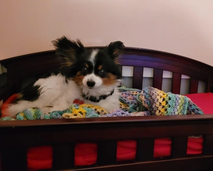 «Моя собака любит дрыхнуть со мной, но я сплю слишком беспокойно. Поэтому я купила и поставила рядом с кроватью пеленальный столик. Питомцу это понравилось»