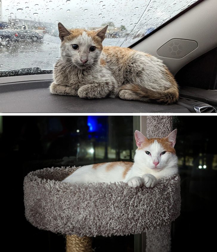 «Наш кот 15 сентября 2017 года — в день, когда он был подобран на улице, — и сегодня»