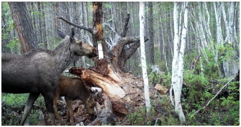Поваленное дерево приглянулось сразу нескольким животным. Около дерева прошли: косуля, лосиха с потомством, волк, бабушка и медведь.