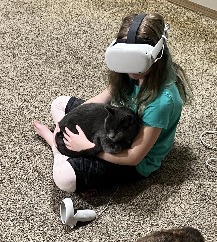 5. “Дочь вынуждена была прервать игру в очках виртуальной реальности, потому что кот постоянно мешал процессу. Теперь эта наглющая морда сидит у нее на руках и явно выглядит очень довольным собой.”
