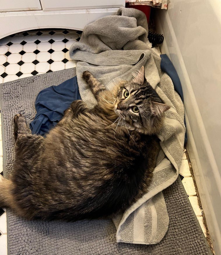 2. “Знает, что ему нельзя в ванную, но решил хотя бы лапку под дверь просунуть”