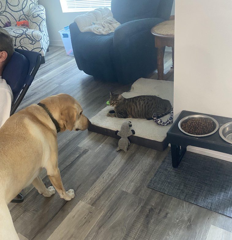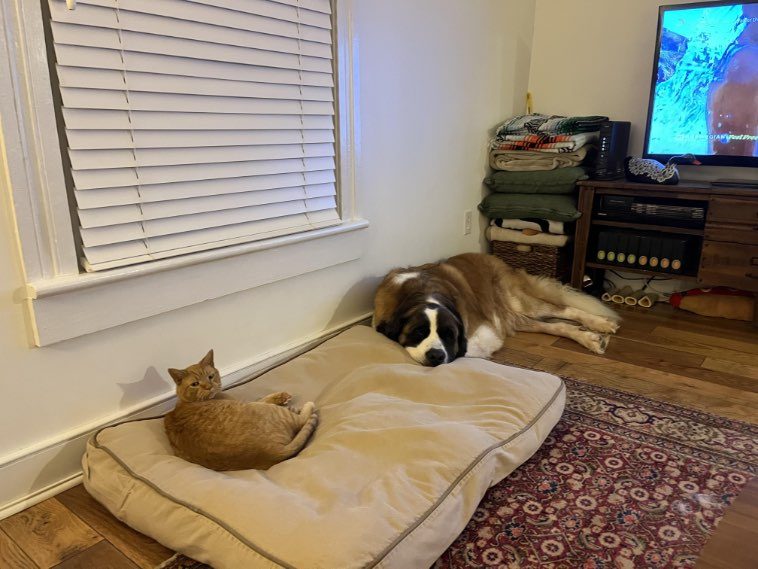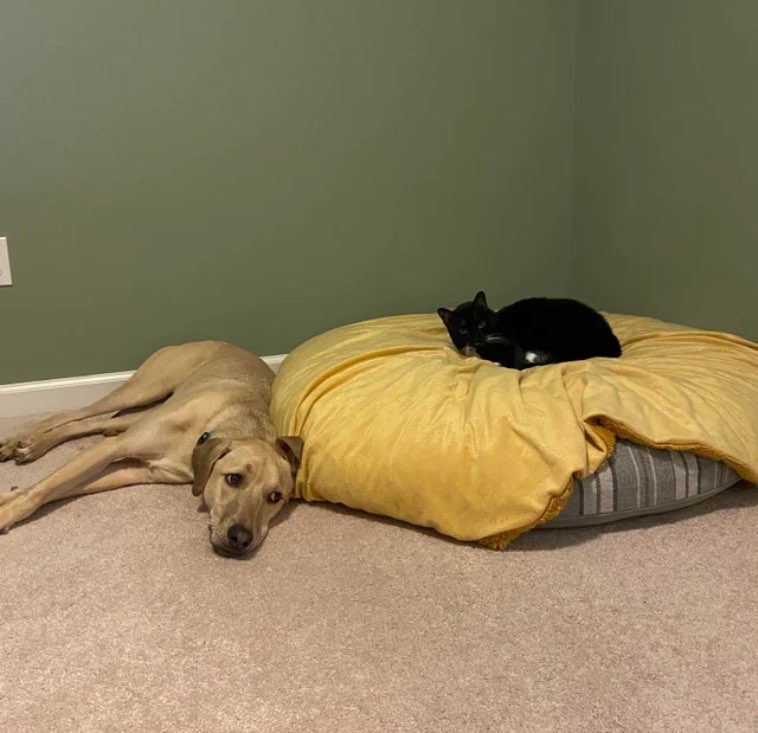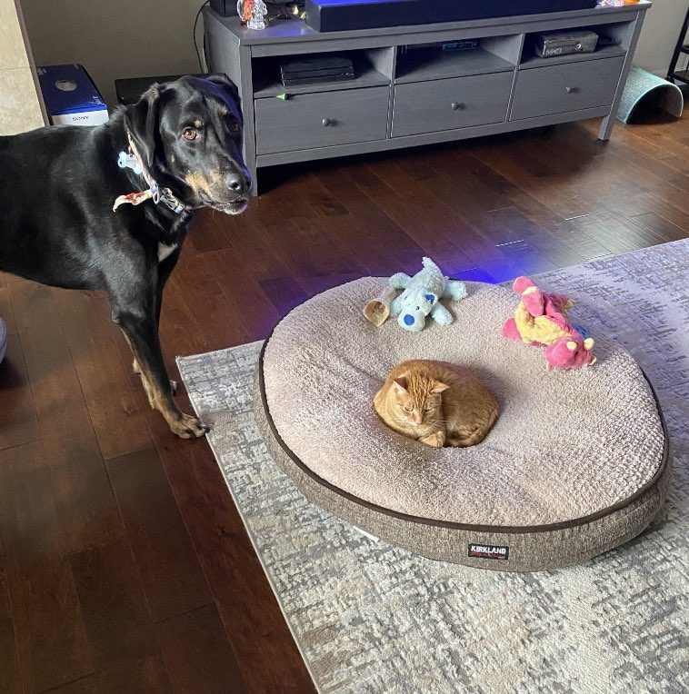 13. “Эту картину мы наблюдаем каждый день. Такое впечатление, что выгнать с лежанки собаку для нашей кошки — это уже дело принципа.”