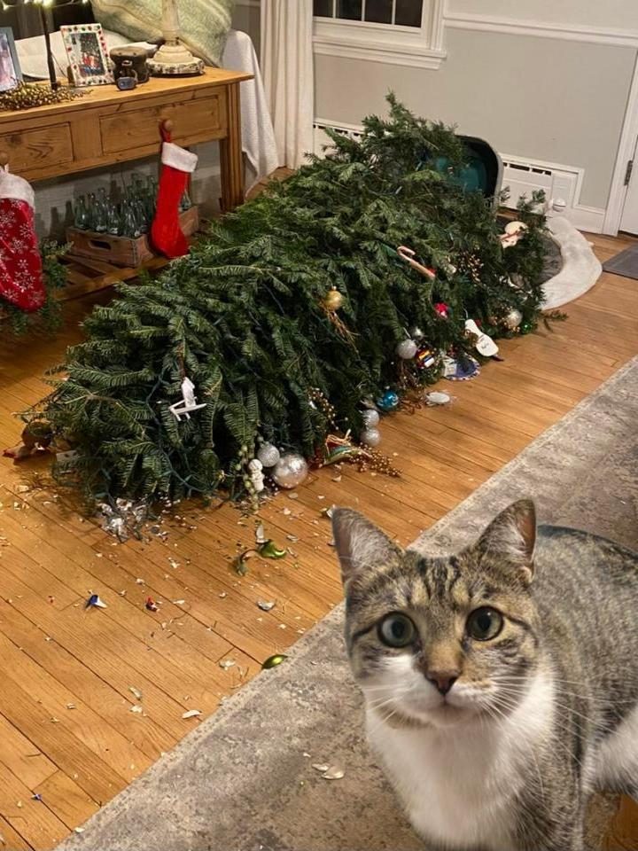 13. “В борьбе с елками коты используют самые разные методы. Но я впервые вижу хвостатого, который решил ее съесть.”