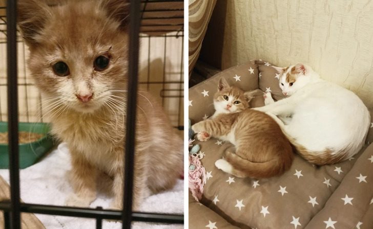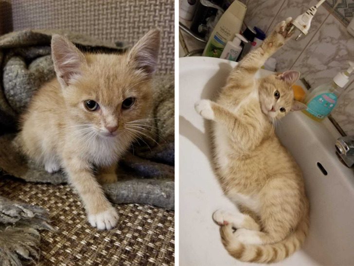 «Папа подобрал котенка на трассе. Вот он в первый день у нас дома и через несколько месяцев»