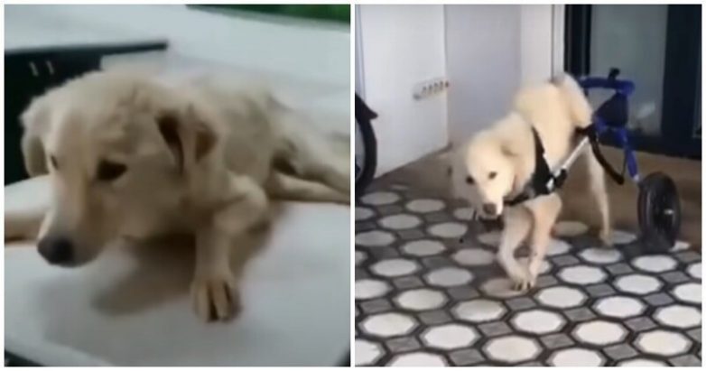 Неравнодушные люди выходили частично парализованную собаку с серьёзным переломом. На опубликованных в сети кадрах животное заново учится ходить.