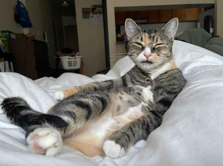 Вот так этот пушистый зверь показывает, как сильно он любит кататься по кровати