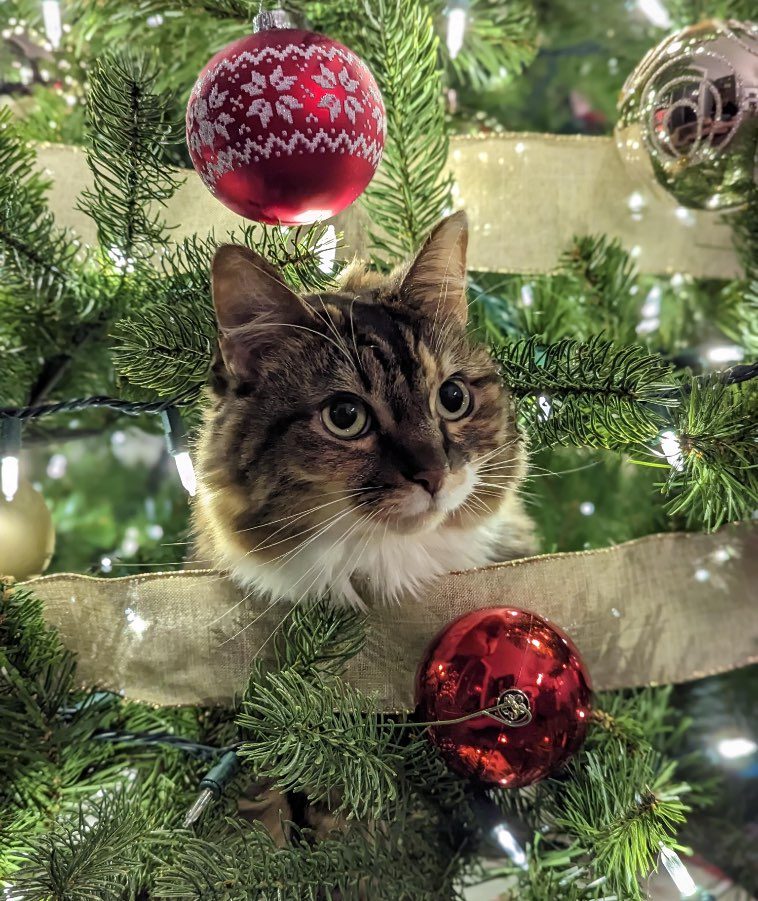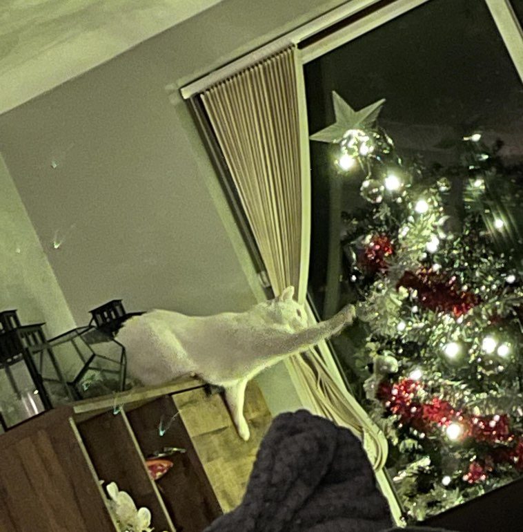 10. “Кошка Йети впервые видит гирлянду, поэтому она немного растерялась”